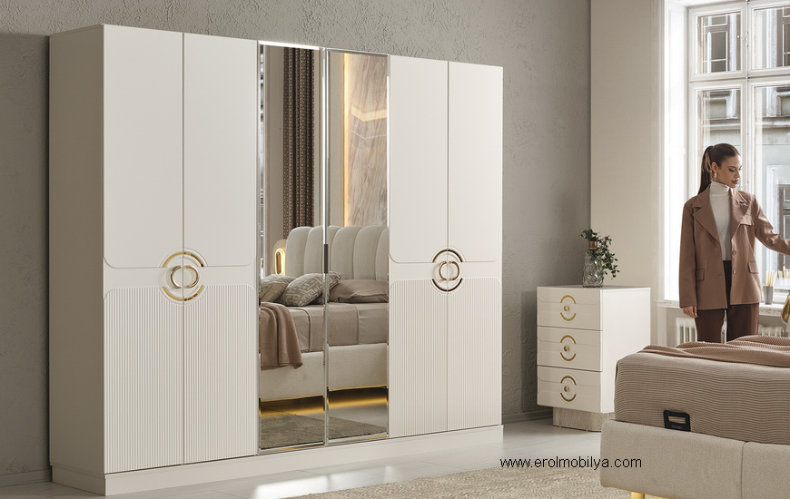 Ürüne Ait Parça Adetleri : 6 Kapılı Dolap, Şifonyer + Aynası, 2 Adet Komodin, Başlık , Çamaşırlık Bu Üründe Başlığa Uygun Baza ve Yatak Ölçüsü : 150 cm * 200 cm veya 160 cm * 200 cm dir(Yaylı Yatak ve Baza Fiyata Dahil Değildir) * TSE |