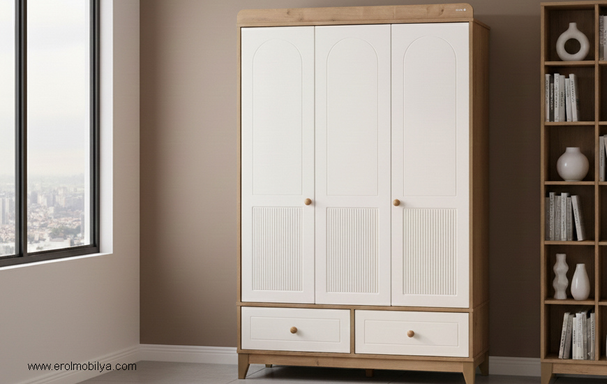 Ürüne Ait Parça Adetleri : 3 Kapılı Gardırop Ürün Özellikleri; ÜRÜN RENGİ : KREM - MEŞE * TSE * ISO 9000 * E1 Belgesi ( Kansorojen Madde İçermez ) * E0 Belgesi ( Kurşun İçermez ) * İnsan , Çevre ve Güvenlik Üçgeninde Üçlü Sorumluluk Bilinci * Üretiminde Gövde Kısmı E-1 Kalite Belgeli Melamin Yonga Levha , Ön Kapak ve Çekmece Yüzeylerinde MDF Kullanılmaktadır. * Çekmecelerde Çift Açılım Teleskopik Ray Kullanılmaktadır * Tamamen Demonte ve Yarı Demonte Olarak Üretim |